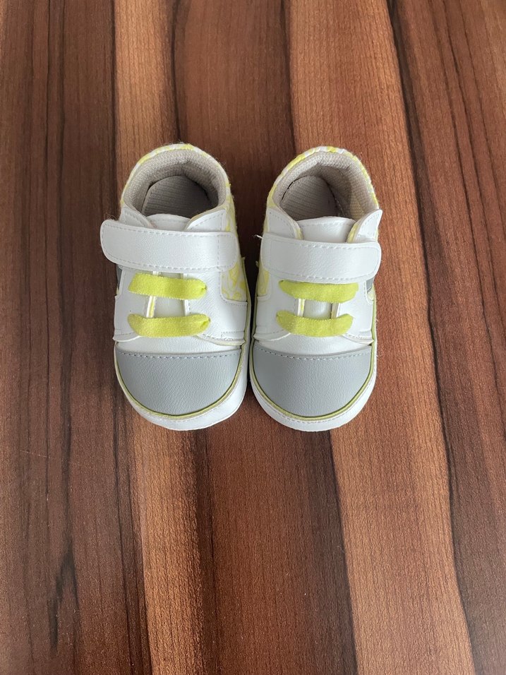 Sarı renkte, renkli tie-dye desenli, lastik tabanlı ve cırt cırtlı bağlamaya sahip erkek bebek ayakkabısı. Sokak stiline uygun. 17 numara
