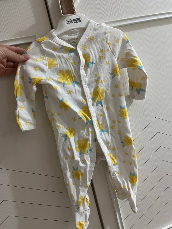 Pastel sarı bağlama desenli, düğmeli, uzun kollu bebek kız tulumu. Ayakları kapalıdır, tam koruma sağlar.