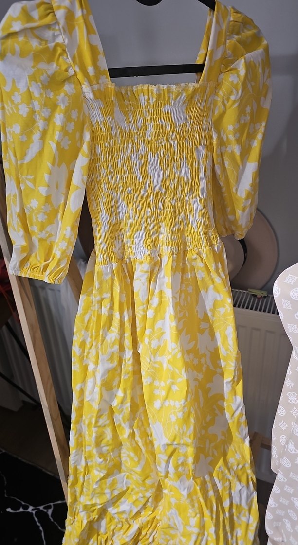 Sarı midi boy, bol kesim elbise, tekne yaka ve kısa fırfırlı kollara sahip, hafif bağlama desenli yumuşak sentetik kumaştan yapılmıştır.