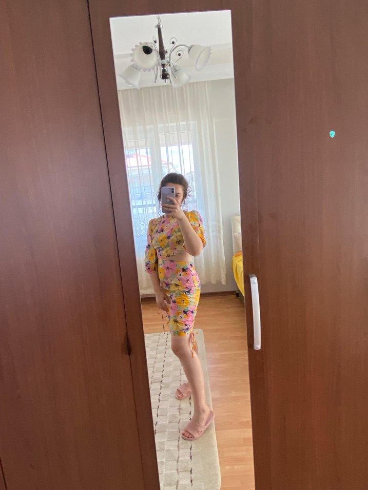 Kısa kollu, sarı bağlama desenli midi elbise, çağdaş ve bohem tarzları bir araya getirir.