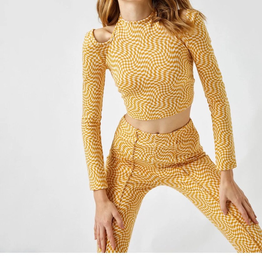 Sarı bağlama desenli, yüksek yakalı ve uzun kollu bu dar kesim üst, tek omuzda pile detayına sahiptir. Sentetik kumaştan, günlük kullanım için uygundur.