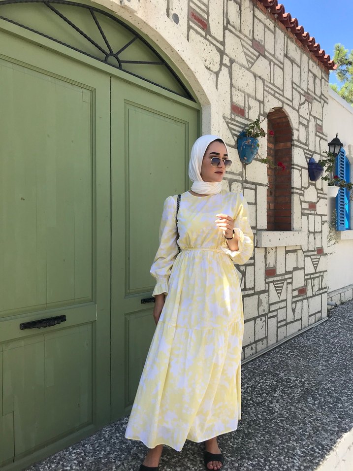 Sarı bağlama desenli uzun elbise, yüksek yakalı ve uzun kolludur. Salaş kesimi ve yumuşak sentetik kumaşıyla modest sokak stiline uygundur.