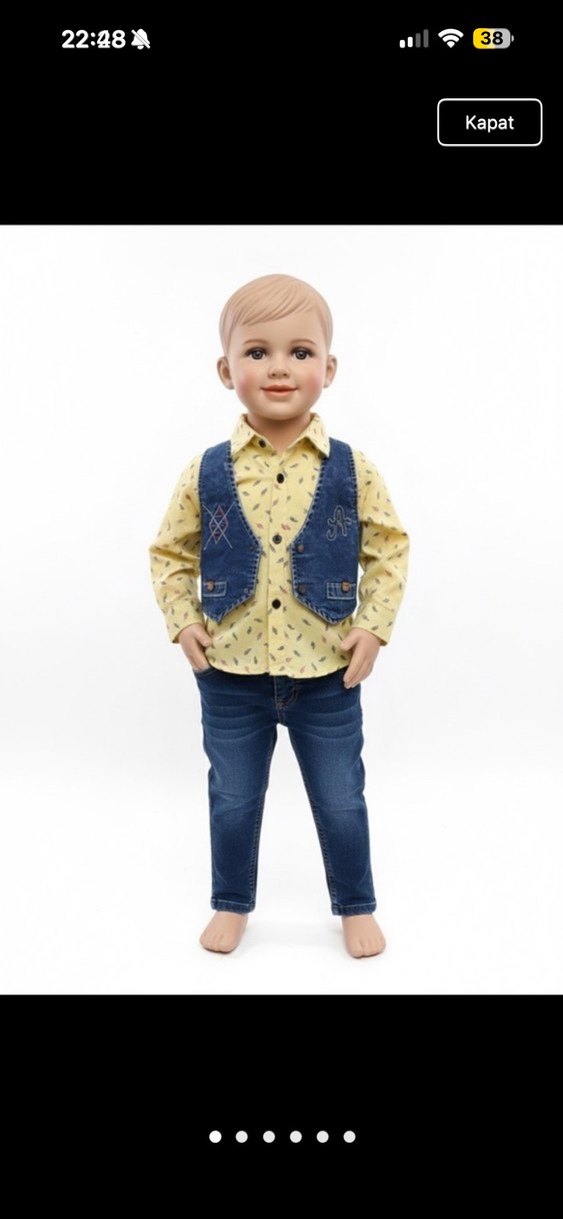 Sarı bağlamalı gömlek, kesik yakalı ve düğmeli, mavi kot yelek ve kot pantolon ile bebek erkek takım.