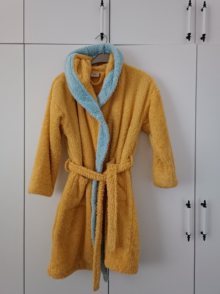 pastel sarı renkte, mavi iç yakalı ve bağlamalı yumuşak bornoz. 12 14 yaş arası çocuk bornoz . ben sabahlık olarak kullandım kilom 55