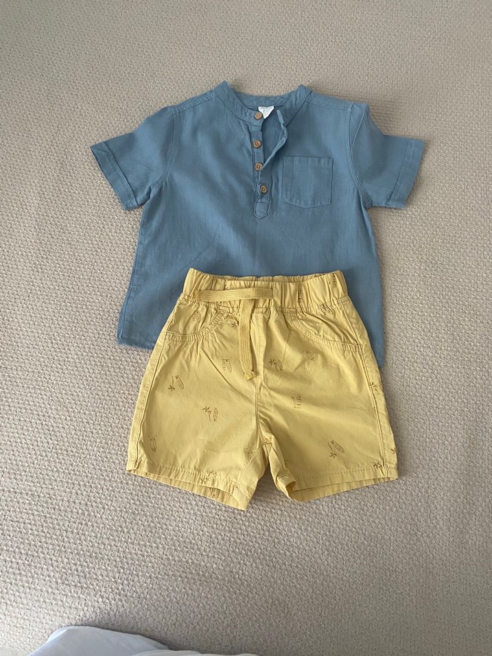Pamuklu, kısa kollu, düğmeli yakalı mavi üst ve pastel sarı bağlamalı desenli şortlu bebek erkek takımı.