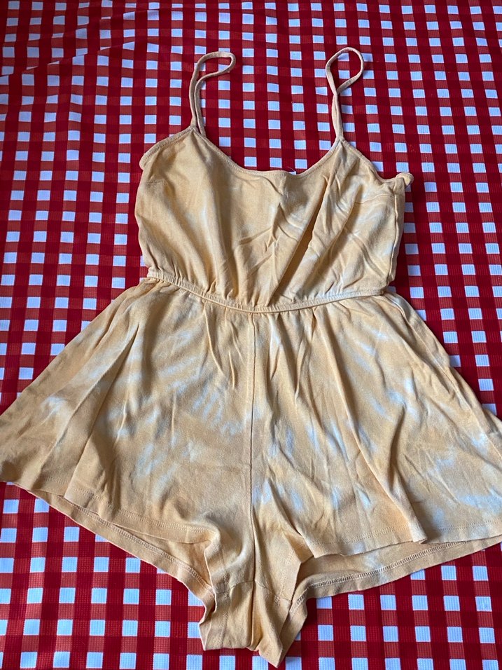 Yumuşak keten kumaştan, bağlamalı desenli, ince askılı, bol kesim sarı mini tulum. Parti için vintage bohem tarzında şık ve rahat.