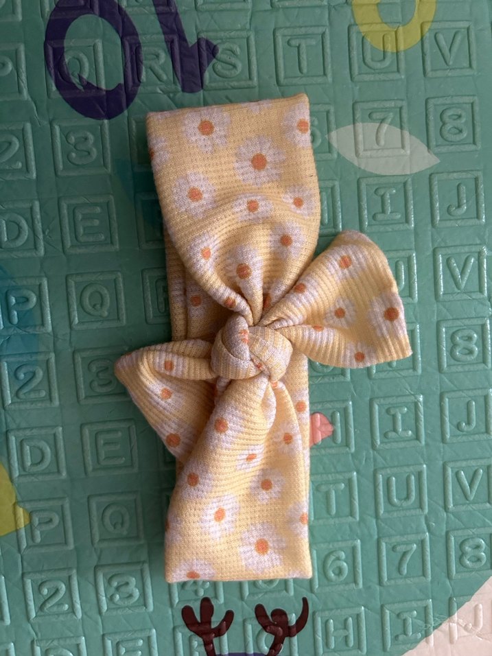 Pastel sarı renkte, bağlamalı fiyonk detaylı ve tie-dye desenli çocuk saç bandı, bohem ve retro tarzda.