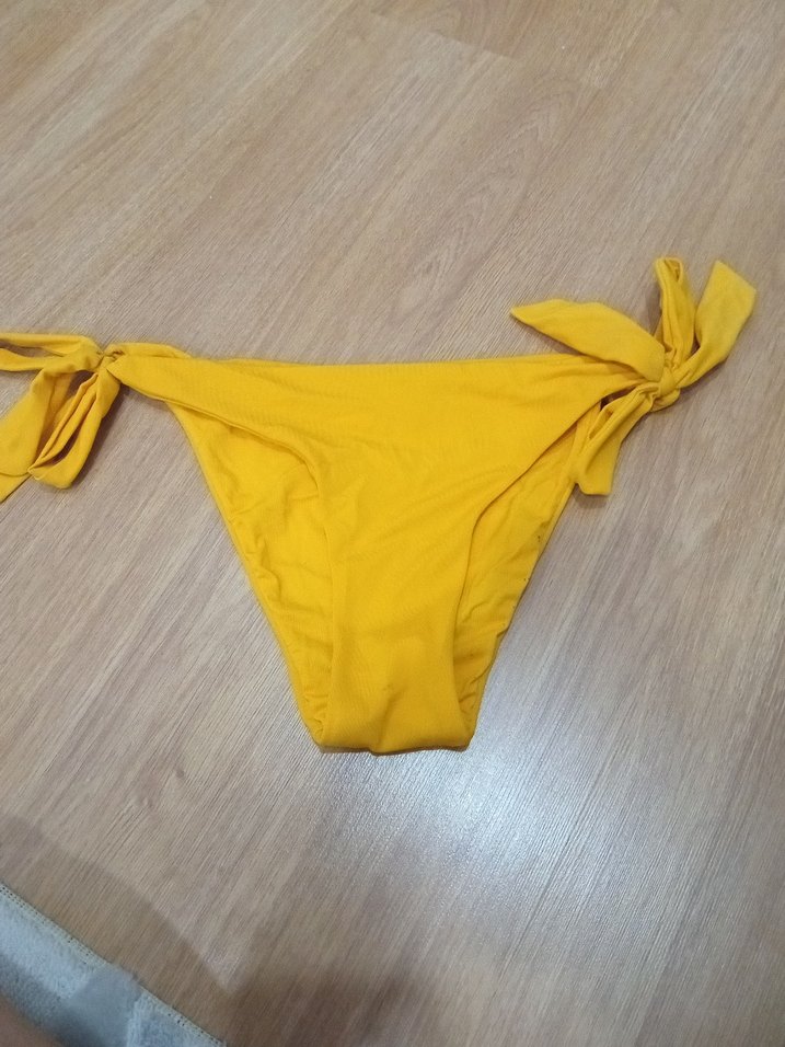 Yanları bağlamalı, sarı renkli, plaj için uygun, vücuda oturan bikini altı.