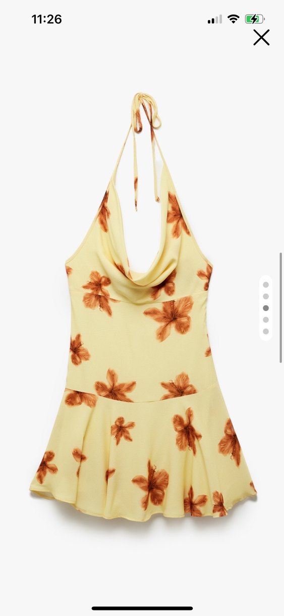 Sarı, askılı ve drapeli yakaya sahip, çiçek desenli bağlamalı mini bohem elbise, yumuşak sentetik kumaştan üretilmiştir.
