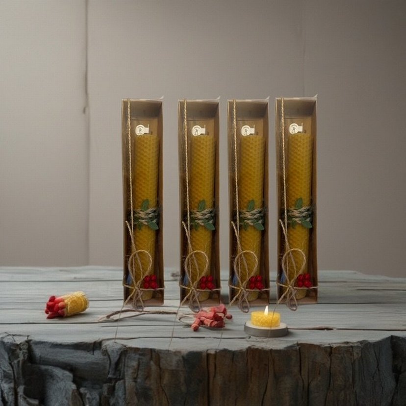 ️Doğal balmumundan üretilen bu zarif mum, sade süslemesiyle öne çıkar. Kutu içinde 1 adet mum bulunmaktadır. • %100 balmumu • 21 cm uzunluk