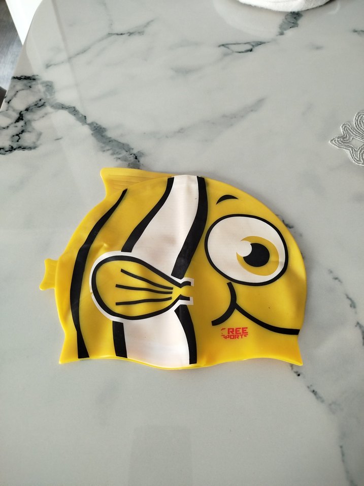 Yumuşak ve esnek malzemeden yapılmış, renkli balık desenli sarı çocuk yüzme bonesi.