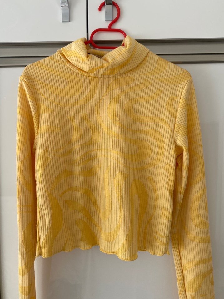 Sarı balıkçı yaka, uzun kollu, ince triko kazak. Yumuşak keten kumaştan, pastel tonlarda hafif batik desenli, midi boyda rahat ve şık.
