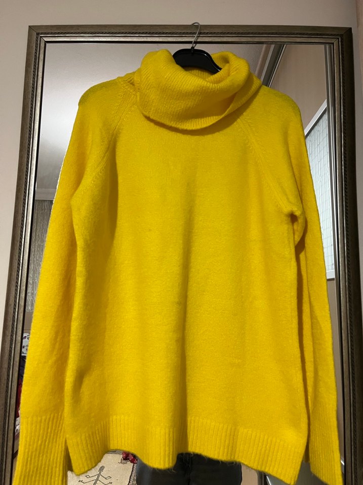 Sarı, parlak görünümlü kadın kazak, balıkçı yaka ve uzun kolludur. Rahat kesim ve normal midi uzunluğunda, yumuşak ve sıcak kumaştan üretilmiştir.