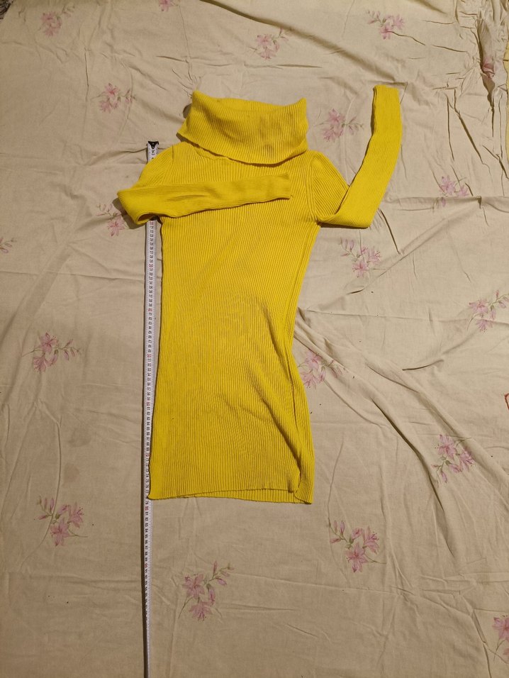 Fitted kesim, balıkçı yaka ve uzun kollu sarı triko elbise. Yumuşak örgü kumaştan, midi boyda, günlük kullanıma uygun. Ölçüleri fotolarda. Deformesiz sorunsuz.