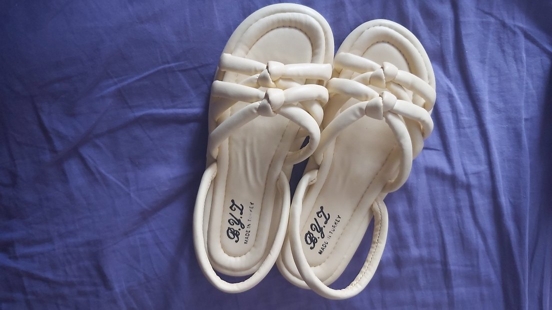 Beyaz dolgu topuklu, tokalı kayışlara sahip kadın sandaletleri. Yumuşak kauçuk malzemeden, minimalist bohem tarzda puf sandalet lila rengide var ikisi alınırsa uygun fiyat yaparım.