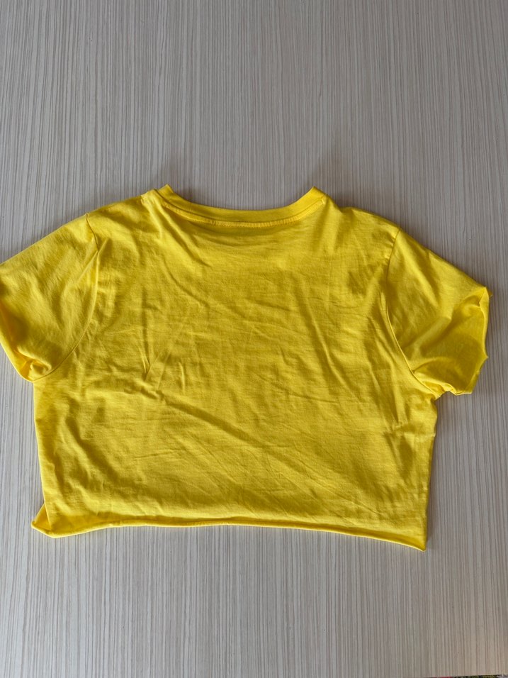 Yumuşak kumaştan, kısa kollu, yuvarlak yaka ve bol kesim sarı crop top. Parlak rengi sayesinde günlük sokak stiline zahmetsiz şıklık katıyor.