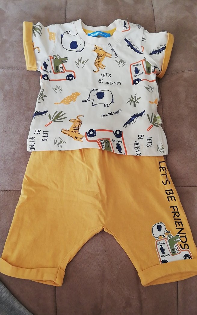 Sarı renkli, kısa kollu, hayvan baskılı bebek erkek takımı. Yumuşak sentetik kumaştan, bisiklet yaka ve renkli desenlere sahip.