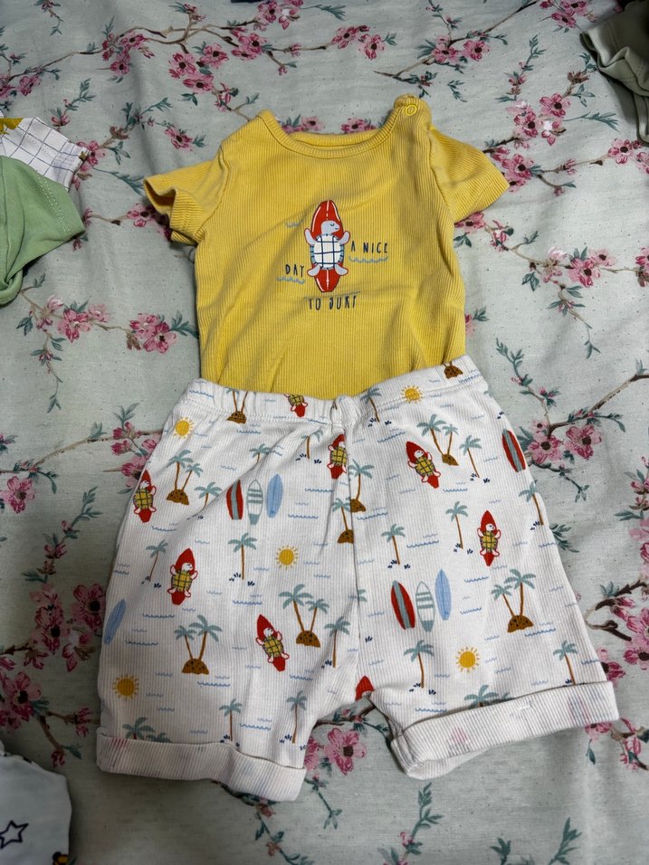 Sarı kısa kollu pamuklu üst, dantel detaylı ve baskılı tasarımlı, beyaz baskılı şort ile tamamlanmış bebek erkek takımı. Sokak stili için uygun, pastel tonlarda.