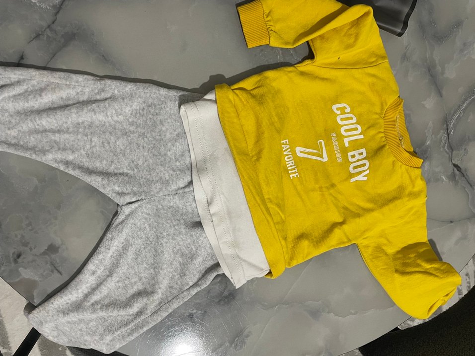 Sarı uzun kollu pamuklu baskılı üst ve gri pamuklu alttan oluşan Favorit Coolbuy marka bebek erkek takımı.