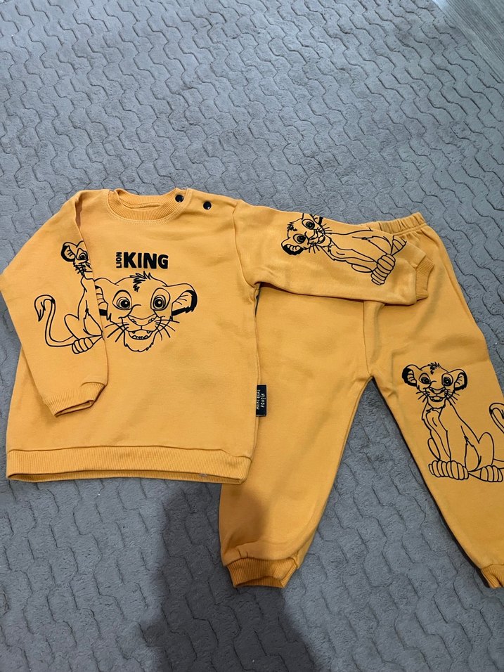 Sarı renkli, uzun kollu ve bisiklet yaka bebek erkek takımı, yumuşak ve sıcak kumaştan üretilmiştir. Renkli baskılar ve örme detaylar içerir, üzerinde 'EKING' yazısı bulunur. Sıfır ürün
