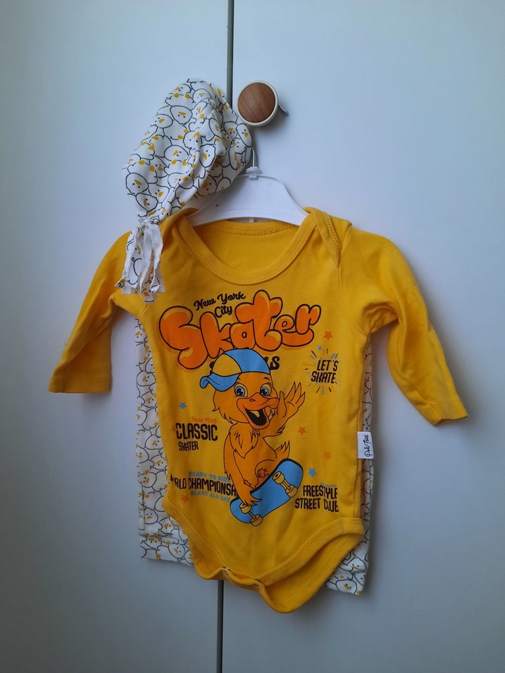 Uzun kollu, sarı renkli, kaykay temalı baskılı bebek erkek takımı. Uyumu desenli şapka ile tamamlanır. Örme sentetik kumaştan üretilmiştir. #beyaz #sarı #civciv #6 ay#9 ay
