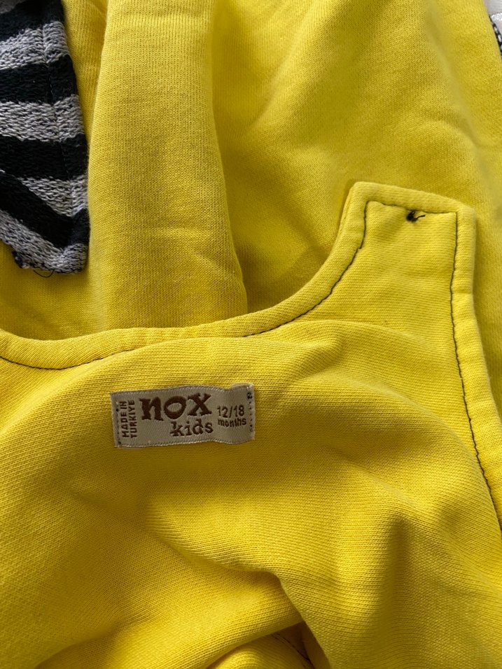 Renkli baskılı desenlere sahip sarı bebek önlüğü, çocuklar için uygundur. Yumuşak kumaşı rahatlık sağlar. 9-12 ay