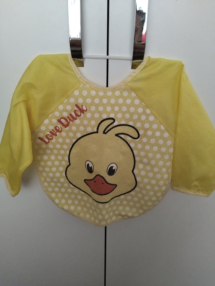 Uzun kollu, sarı renkli bebek önlüğü, renkli ördek baskısı ve puantiye deseni ile. Yumuşak kumaştan yapılmıştır.