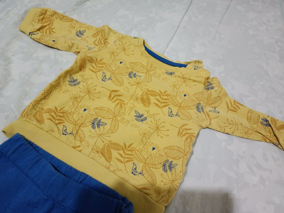 Sarı uzun kollu, baskılı ve düğmeli bebek üstü, rahat sentetik kumaştan. Sokak modasına uygun renkli desenler içerir.