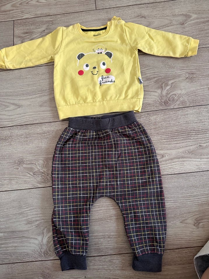 Sarı uzun kollu, düğmeli üst ve renkli ekose desenli pantolondan oluşan, yumuşak ve sıcak kumaşlı bebek erkek takımı.