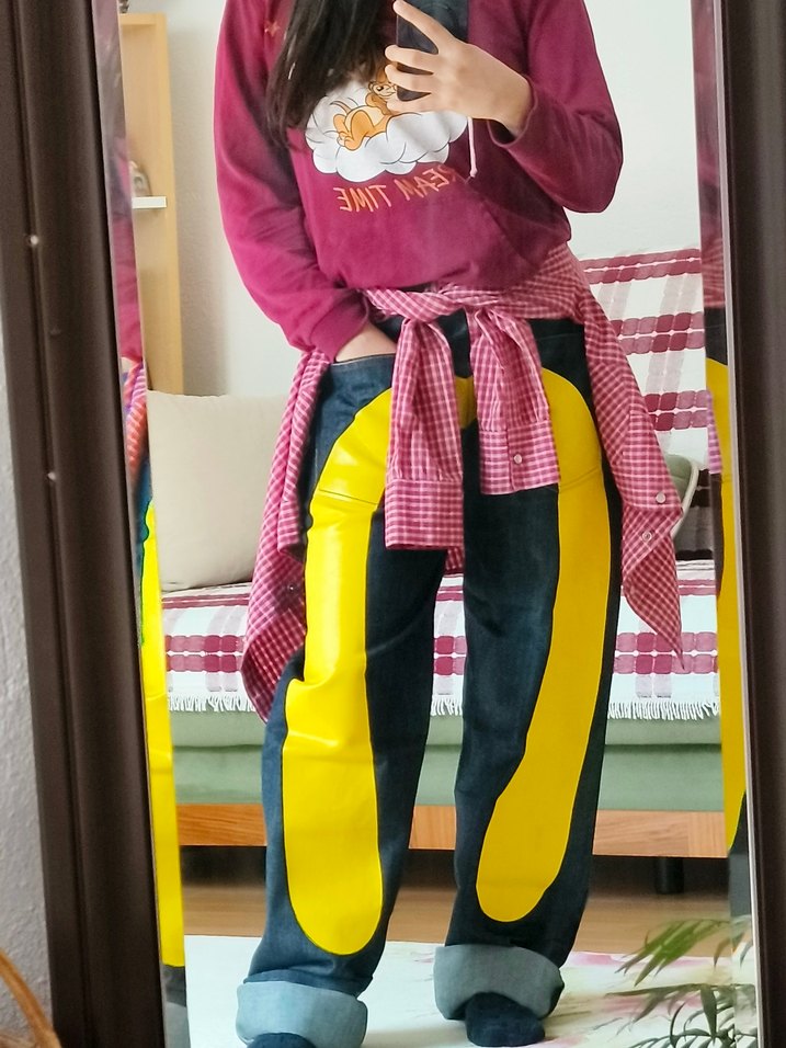 Bol kesim, kemerli kız kot pantolon, parlak sarı baskılı detaylarla sokak modasına uygun.ölçülere dikkat edin Japon ürünü olduğu için beden ölçüleri farklı W27-L34