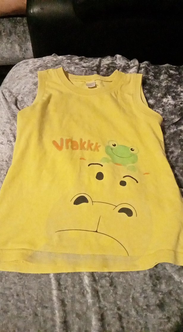 Sarı çocuk atleti, üzerinde renkli kurbağa ve yüz baskısı ile 'yrakkk' yazısı bulunur.