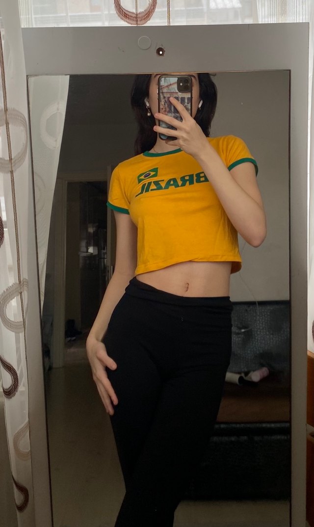 Sarı, kısa kollu, baskılı Brazil desenli crop top. Sentetik kumaştan, spor ve günlük şıklık için uygun.