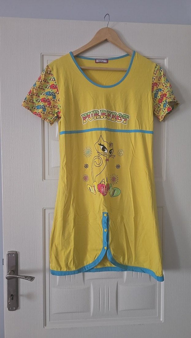 Sarı, renkli baskılı kısa kollu, bisiklet yaka, düğmeli, fitted kesim ev içi gecelik "PURRFEST" yazısı ve kedi deseni bulunur.
