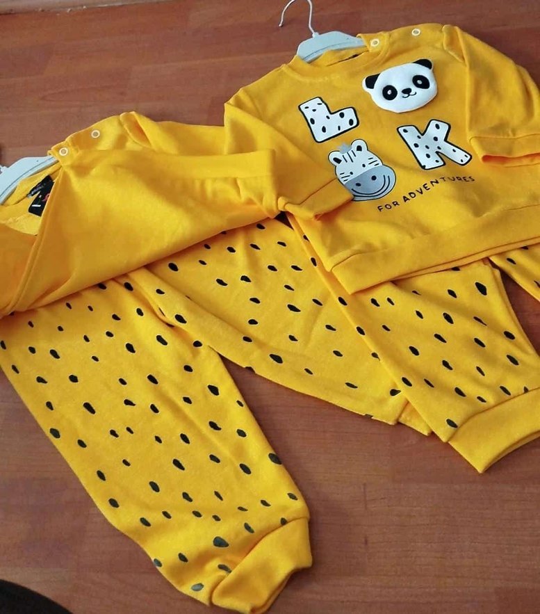 Sarı renkli, uzun kollu, bisiklet yaka erkek bebek takımı. Renkli hayvan baskıları ve yumuşak, sıcak örme kumaş ile rahatlık sağlar.