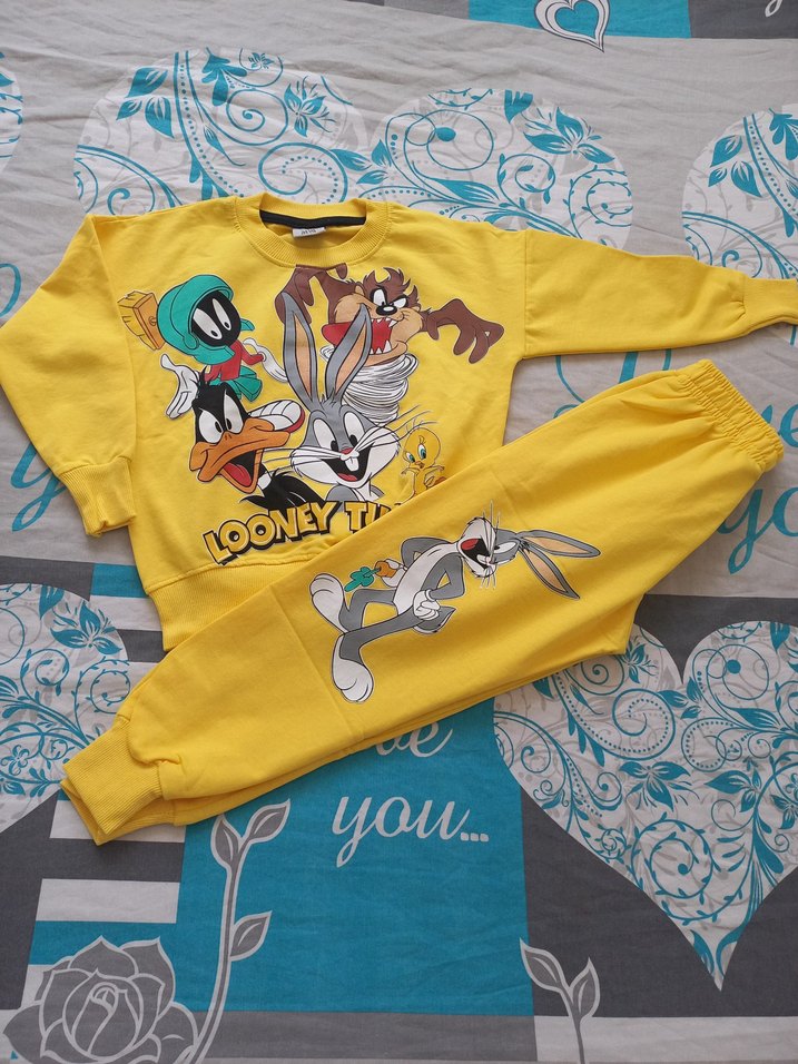 etiketli Sarı renkli, bol kesim erkek çocuk eşofman takımı. Yumuşak ve sıcak kumaş, uzun kollu ve baskılı Looney Tunes figürleriyle. Triko dokulu, bisiklet yaka.