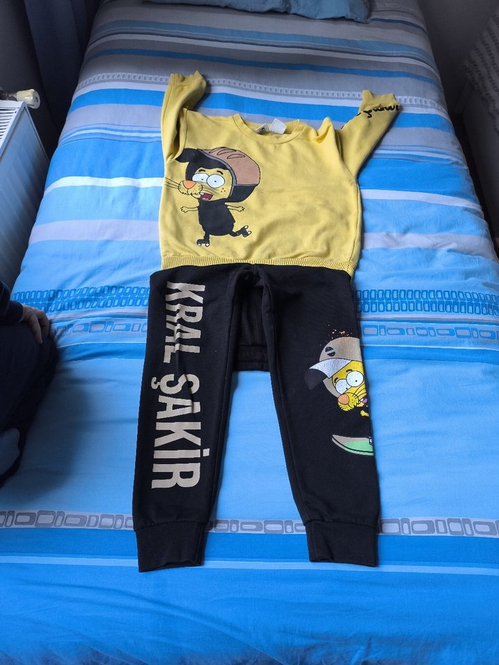 Sarı baskılı, pamuklu ve yumuşak kumaştan yapılmış, fitted kesim erkek çocuk eşofman takımı. Sweatshirt yuvarlak yakalı, pantolonda cırt cırt detay var. "KRAL SAKIR" baskılı. Talım fiyatı 400