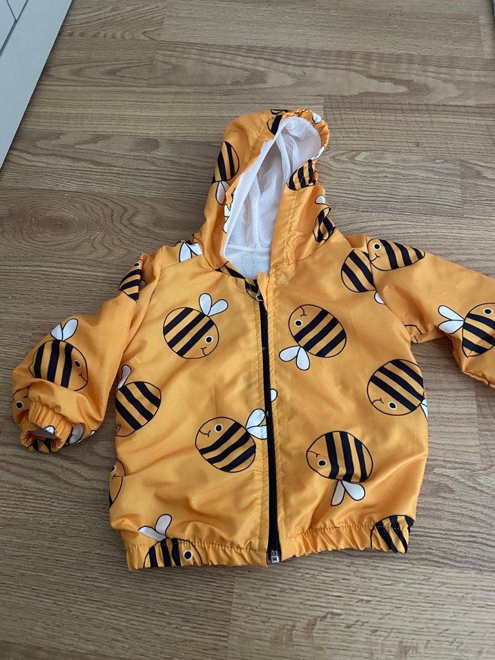 Parlak sarı sentetik kumaştan, kapüşonlu ve fermuarlı, baskılı arı desenli erkek çocuk için dar kesim yağmurluk.
