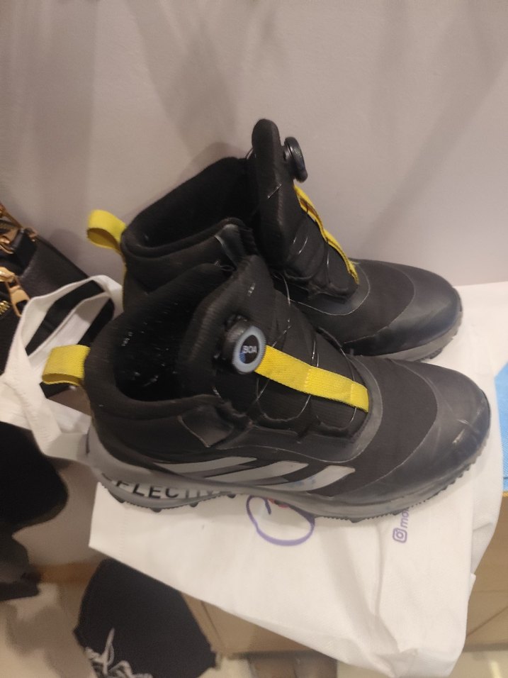 Siyah kauçuk malzemeden yapılmış, sarı baskılı detaylara ve kolay kullanım için cırt cırt bantlı erkek çocuk botları.