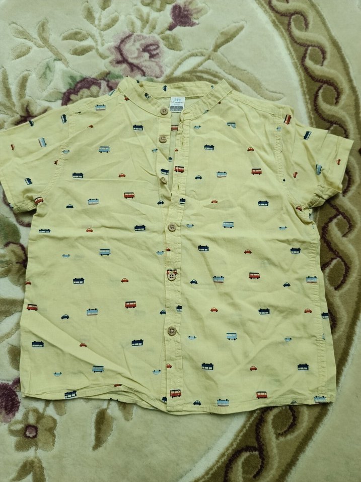 Pamuklu, düğmeli, kısa kollu, yakalı ve bol kesim sarı baskılı erkek çocuk gömleği, rahat sokak stili için uygundur.
