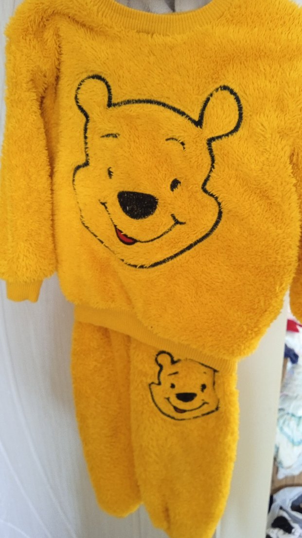 Sarı renkli, yumuşak ve rahat kumaştan yapılmış erkek pijama takim üzerinde gülen ayı yüzü baskısı bulunmaktadır.
