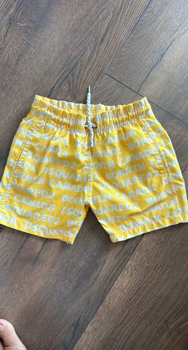 Sarı renkte, marka yazılı baskılı, lastikli ve bağcıklı erkek çocuk mayo şortu.