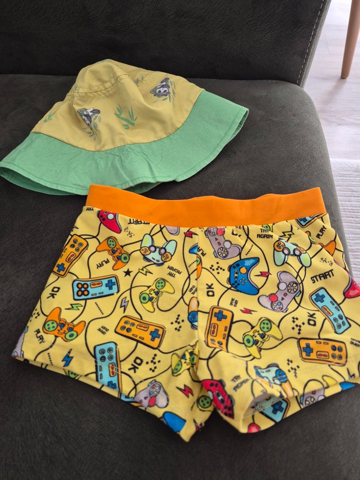Sarı, renkli baskılı oyun kumandası desenli erkek çocuk mayo şortu, turuncu bel bandı ile. Açık sarı ve yeşil şapka ile birlikte. Mayo kolay kurur