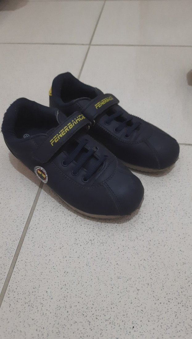 Sarı baskılı, cırt cırtlı erkek çocuk spor ayakkabısı. Kauçuk tabanlı, şehir tarzına uygun. Üzerinde "FENERBAHÇE" yazısı bulunur.
