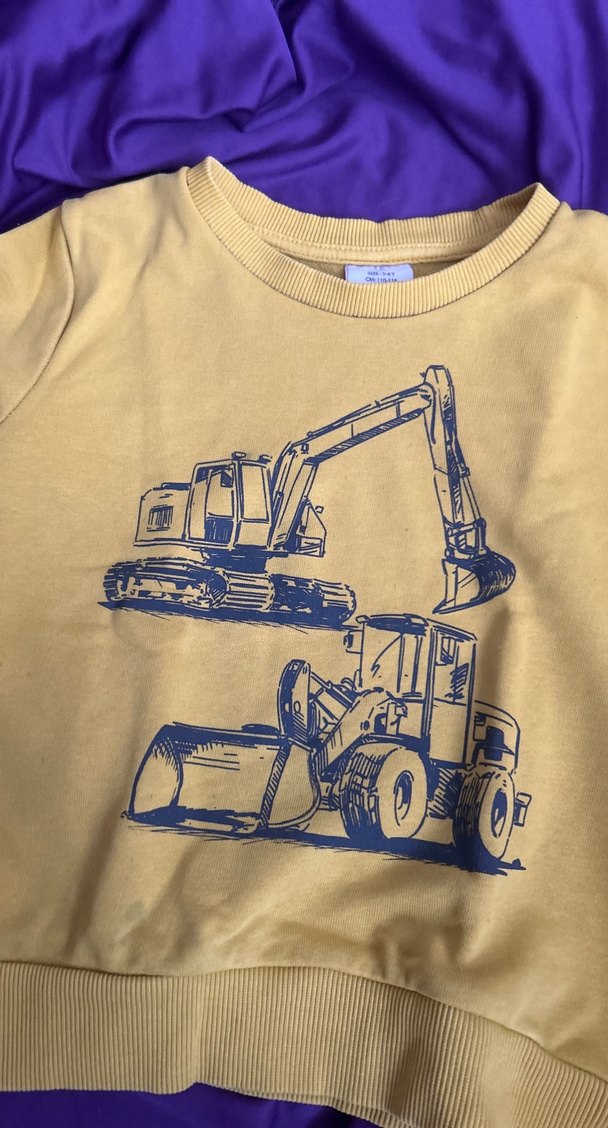 Sarı renkli, uzun kollu, bisiklet yaka erkek çocuk sweatshirtü. Yumuşak kumaştan, bol kesim ve baskılı inşaat araçları deseniyle sokak tarzına uygun.