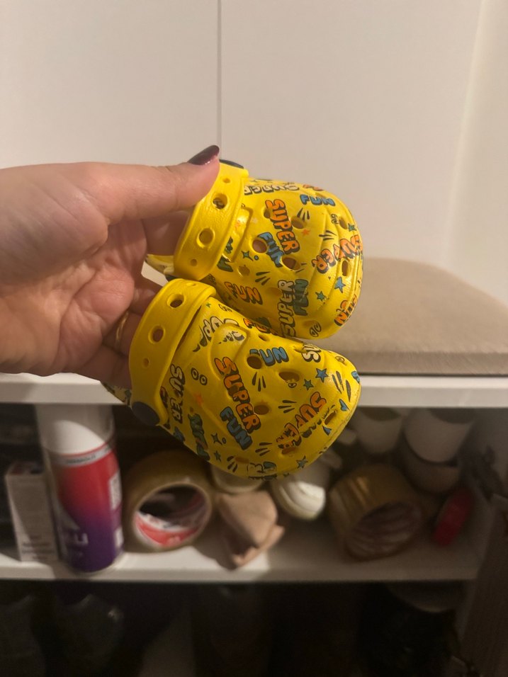 Sarı renkli, baskılı ve pop kültür temalı erkek çocuk crocs terlik Numarası oğluma olmuyor malum ayakları çabuk büyüdüğü için çok giyilmedi silinse tertemiz olur
