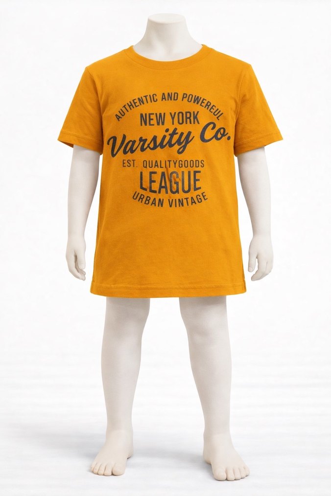 Sarı renkli, kısa kollu, yuvarlak yaka ve bol kesim erkek çocuk tişörtü. Canlı renklerde varsity tarzı baskı ve yumuşak sentetik kumaş içerir.