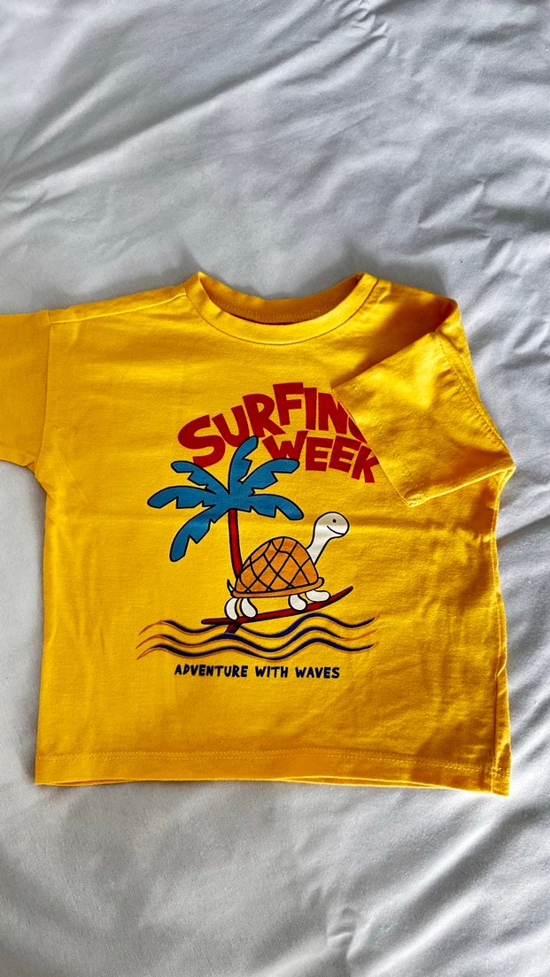 Sarı renkli, bol kesim, boğazlı ve kısa kollu erkek çocuk tişörtü. Parlak baskıda palmiye altında sörf yapan kaplumbağa ve 'SURFING WEEK' ile 'ADVENTURE WITH WAVES' yazıları bulunur. Sentetik kumaştan üretilmiş, sokak modası tarzında.