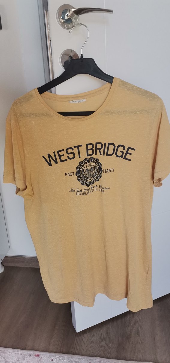 Sarı renkte, pamuk kumaştan yapılmış erkek kısa kollu tişört. Üzerinde "WEST BRIDGE" baskısı ve tokalı detaylar bulunur. Salaş kesim ve normal boydadır.