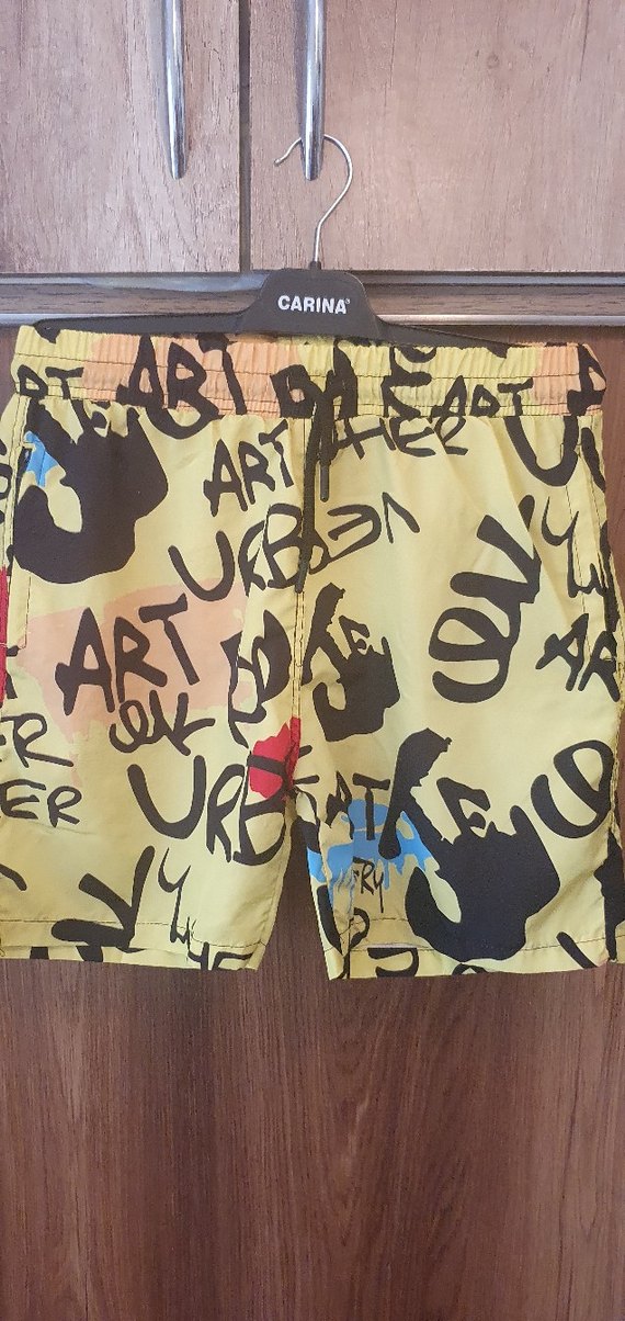 Renkli baskılı sokak sanatı desenleriyle sarı, bol kesim mini erkek şort. Lastikli bel bandı ve dikkat çekici grafiti yazıları içerir, plaj için uygundur.