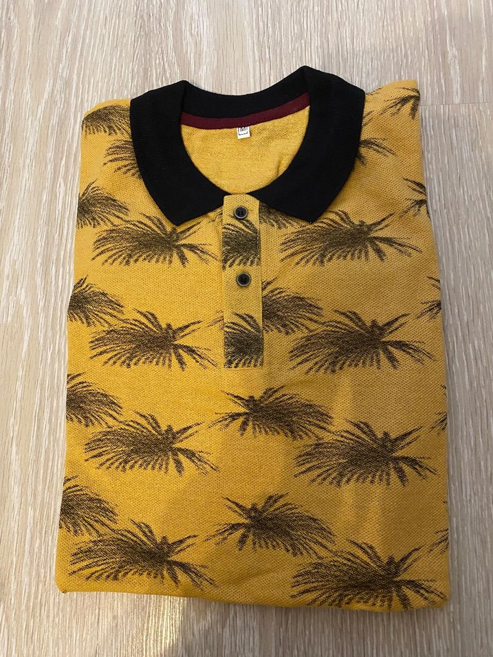 Sarı baskılı erkek polo tişört, kısa kollu ve siyah yakalıdır. Sentetik kumaştan yapılmış, düğmeli ve dar kesimdir. Günlük rahat sokak stili için uygundur.Pazar malıdır çok kaliteli bir şey beklemeyin hiç giyilmedi sıfır ürün.